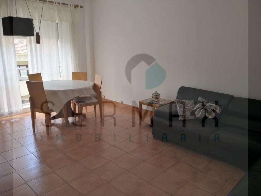 T3 com garagem, mobilado, composto por 3 quartos, 2 quartos de banho, sala com varanda, lavandaria e cozinha equipada com placa, frigorífico...