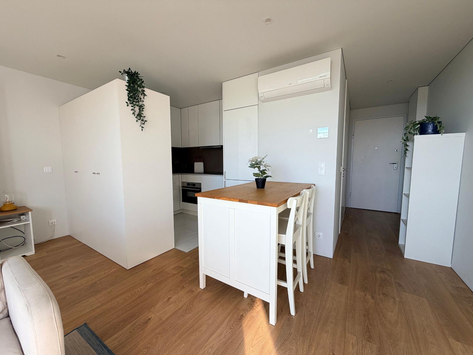 T1 Semi Mobilado para venda no PortoApartamento novo para venda, construção terminada em 2022, com lugar de garagem para 1 viatura e preparada para carregamento de carros eléctricos.Ao entrarmos no prédio, temos elevador ou escadas que nos levam ao 4º andar, aí, um corredor que nos leva ao apartamento. Temos um hall de entrada para a cozinha, arrumos, wc de serviço, sala comum e suite. A cozinha, totalmente equipada, com exaustor, placa, forno, micro-ondas, máquina de lavar loiça e frigorifico combinado. Aqui podemos ir à lavandaria com vistas desafogadas. Sala comum com janela virada para a traseira do prédio. Na suite, temos um hall do quarto com roupeiros embutidos, wc com base de duche e quarto virado para a traseira do prédio. Todo o apartamento tem ar condicionado.Venha visitar e sinta-se em casa.