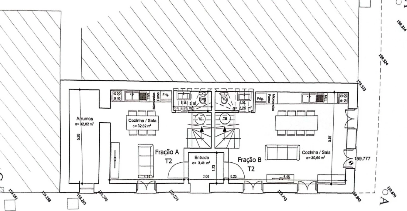 Sala e cozinha em open space com excelente exposição solar e casa de banho de serviço.
