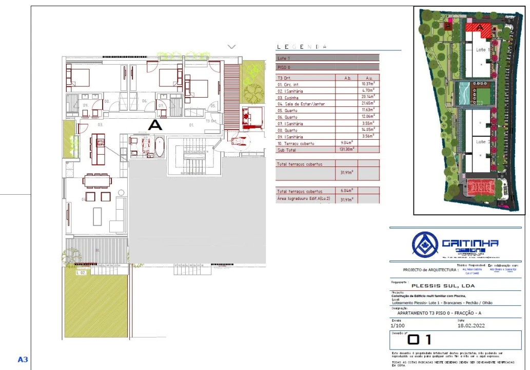Apartamento T3 novo, com 131.3m2 de área de bruta, no r/c do edificio, terraço privativo com 31,91m2, lugar de estacionamento na cave e ainda acesso á piscina comunitária (20m x 9m - até 1,60m profundidade).