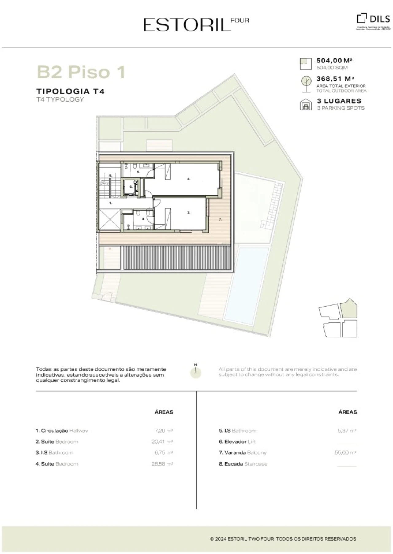 Moradia T4 com 504 m² de área bruta e 368,51 m² de área exterior total, com jardim, piscina e garagem para 3 carros, situada no prestigiado empreendimento Estoril Four.