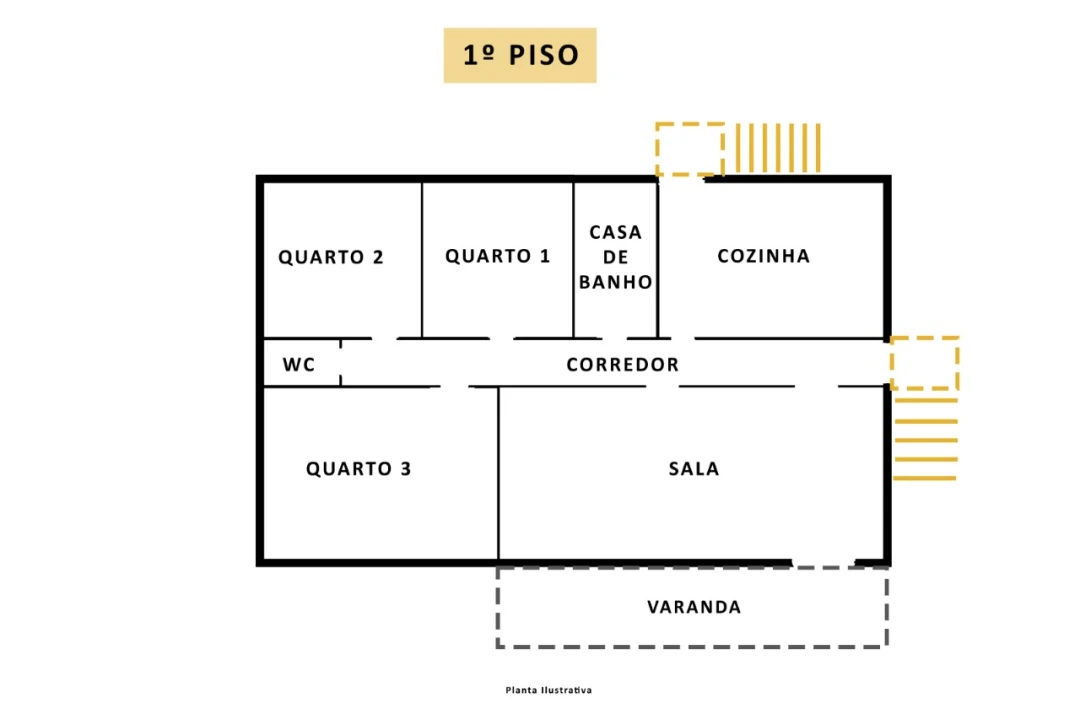 1º Andar: habitação T3 com varanda, 2 WC's, Lareira e Ar condicionado;
