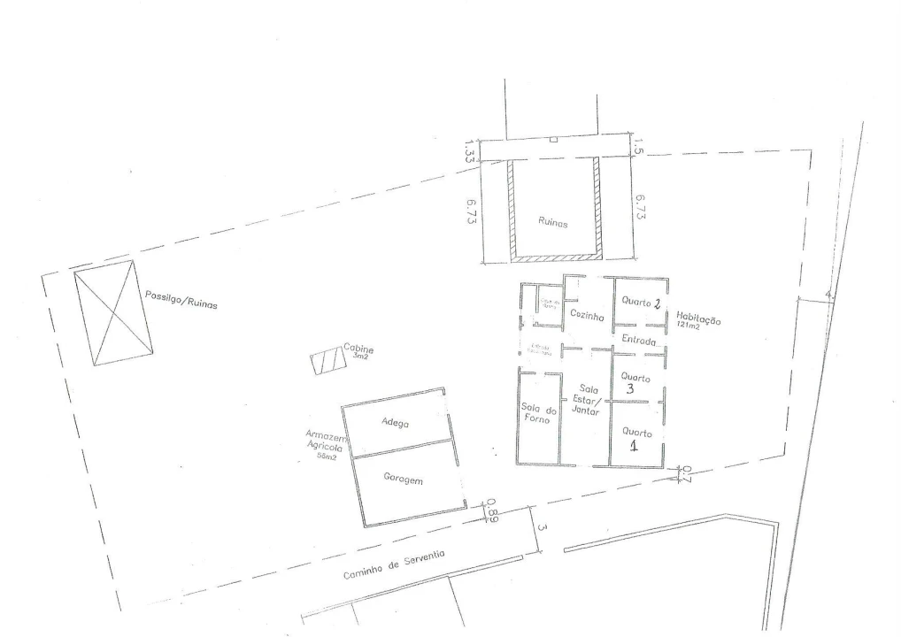 A propriedade é composta por uma moradia T3+1 construída em 1964 com 121 m2 de área, distribuída por três quartos, uma dependência para arrumos, sala de estar e sala de jantar conjuntas, cozinha e casa de banho completa, contado ainda com uma divisão que além de zona de arrumos tem 1 tradicional forno a lenha, que confere um charme rústico ao espaço. Complementarmente dispõe de um armazém com 56 m2 com separação para garagem e adega, uma construção em ruína com cerca de 39 m2, uma cabine fechada com cerca de 3 m2 com furo de água potável no interior e ainda ruínas de uma antiga pocilga com 39 m2; na restante área de terreno existem algumas árvores de fruto.