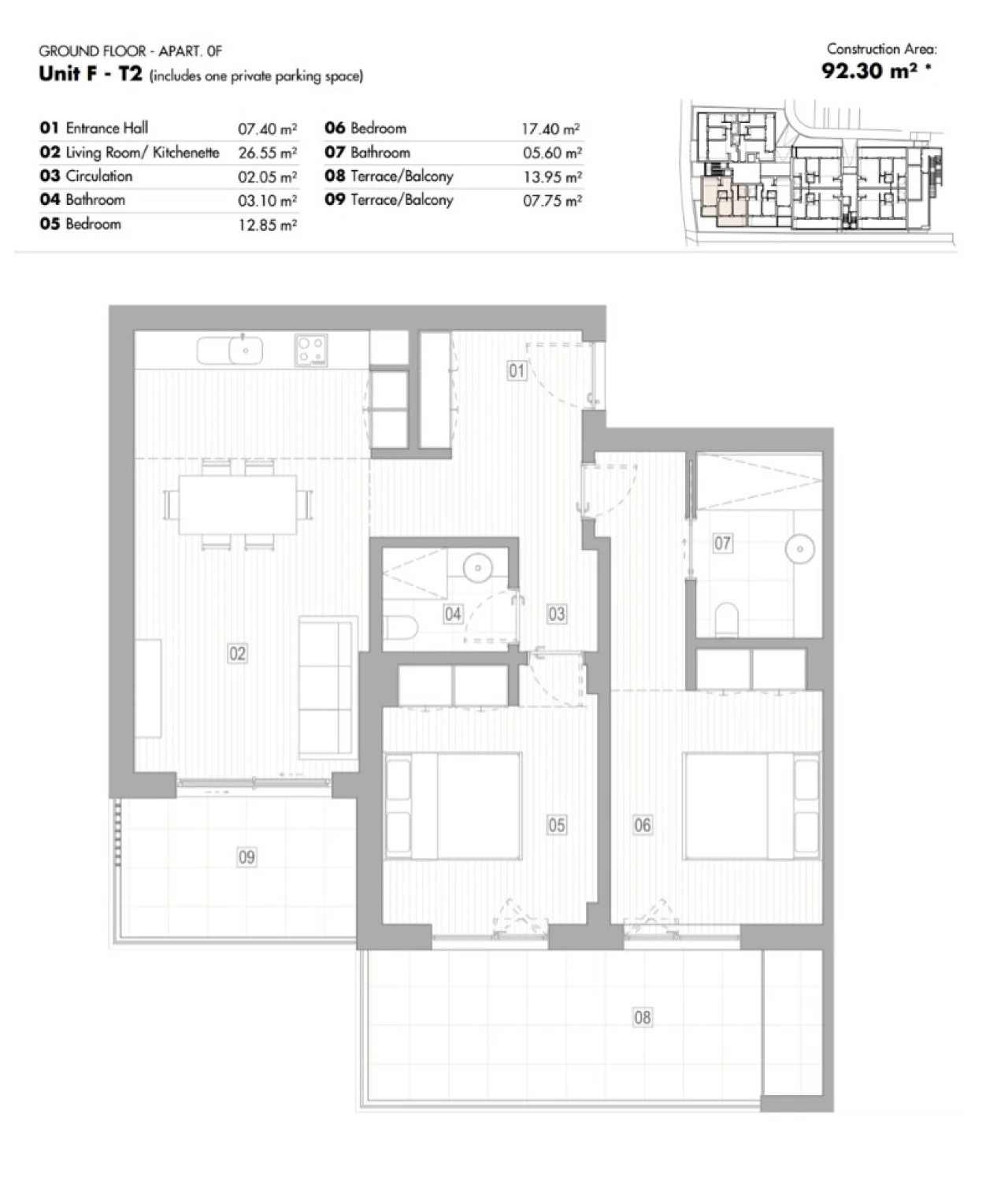 Estes apartamentos espaçosos e cuidadosamente planeados têm 2 quartos, um corredor, cozinha totalmente equipada, sala de estar e 2 casas de banho, proporcionando conforto e facilidade de vida.