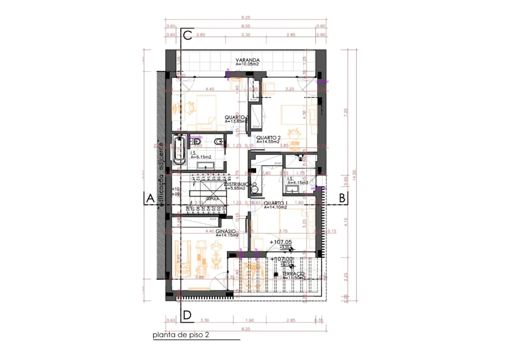 No 1º andar encontramos 4 quartos de 13,65 m2, 14,55 m2, 14,15 m2 2 e 14,10 m2, este último com closet, casa de banho 4.15 m2 e uma varanda de 1105 m2 m2. Existe ainda uma varanda com 10 m2 acessivel por dois dos quartos.