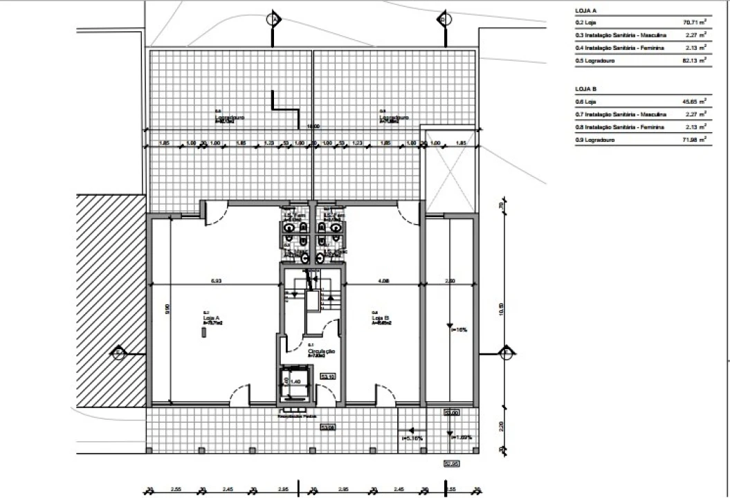 Loja A - Com uma área bruta total de 161 m², esta loja inclui um espaço interno de 71 m² e um generoso terraço de 82 m². Equipada com duas casas de banho, oferece versatilidade e conforto para diversas aplicações comerciais.