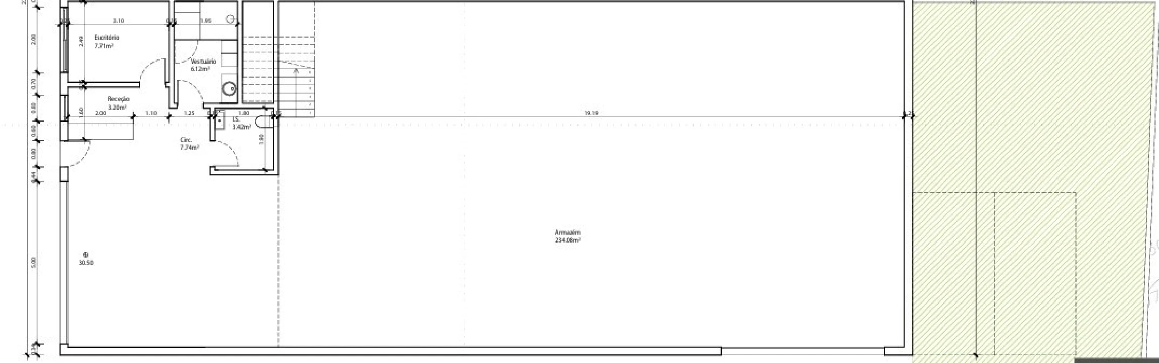 Escritórios com 26,99m2 e 7,71m2. Recepção com 3,20m2. Vestiário de 6,12m2. Duas casas de banho e Mezanino de 34,16m2.