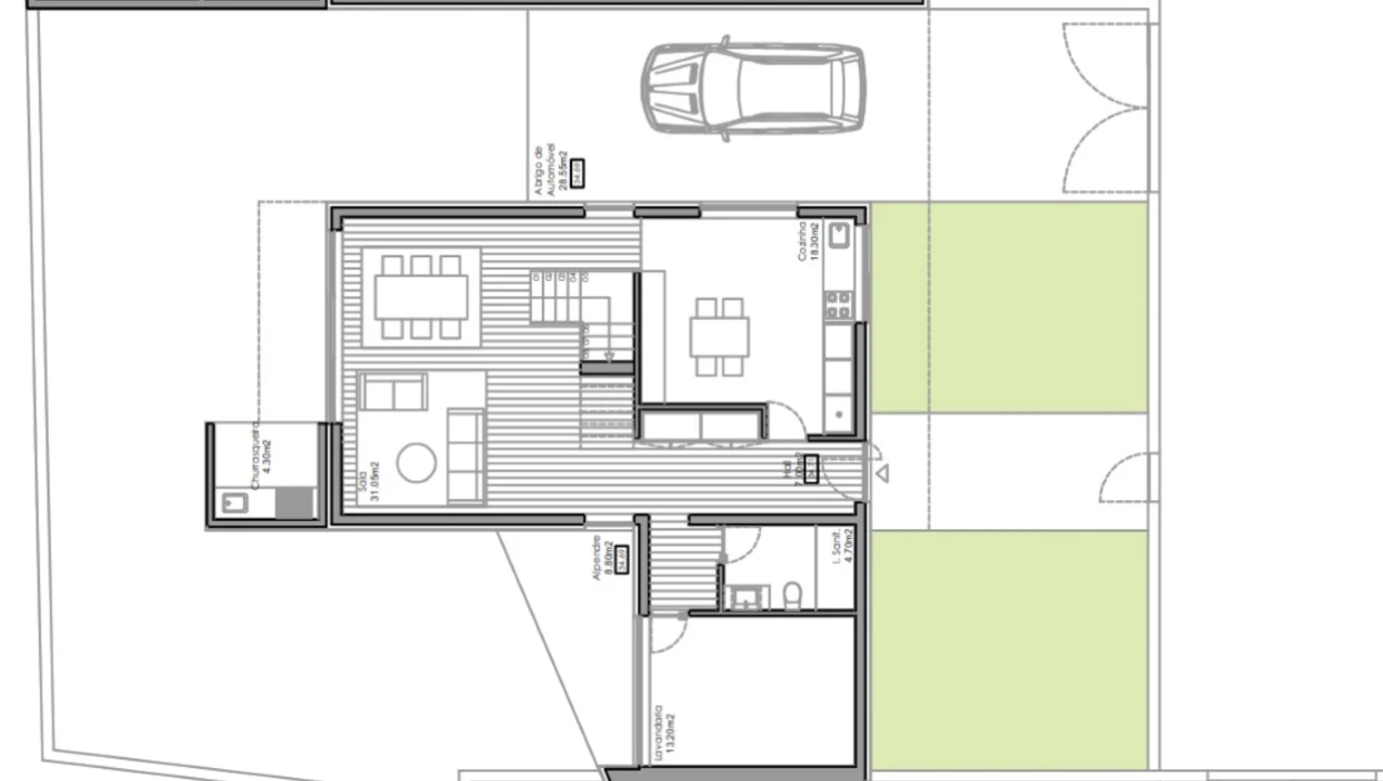 No rés do chão temos um logradouro com jardim, terraço, churrasqueira, cozinha, sala ampla, 1 quarto, 1 Wc de serviço, Lugar de garagem coberto e descoberto, lavandaria e alpendre