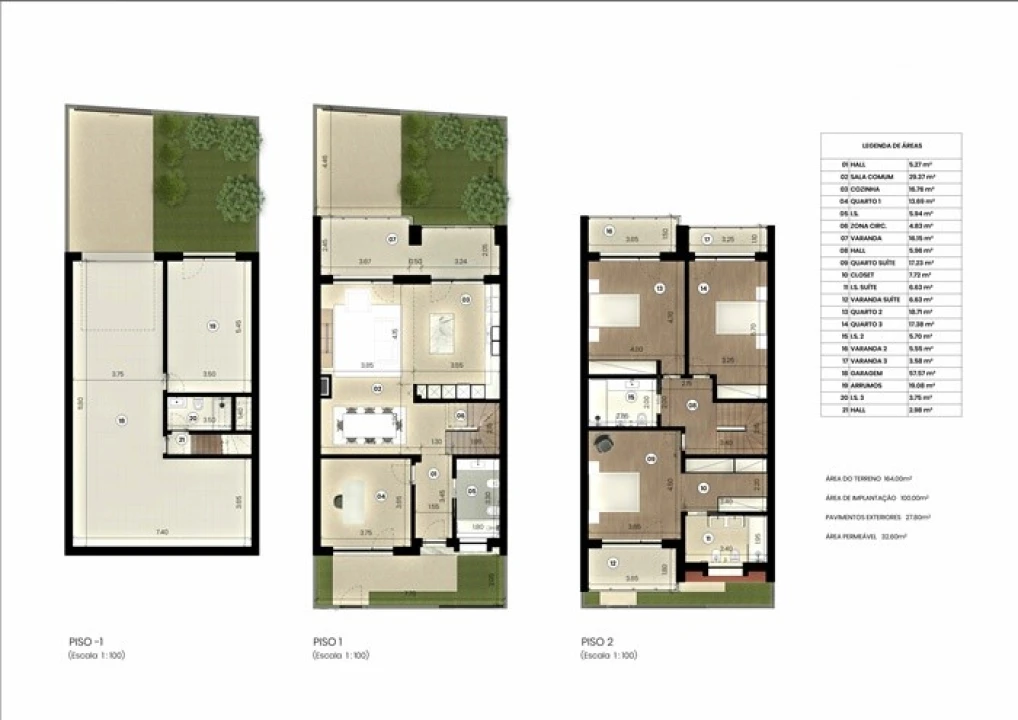 Piso 1: Master suite com closet e casa de banho privativa, dois quartos com roupeiros embutidos e acesso direto a varandas independentes. Casa de banho comum.