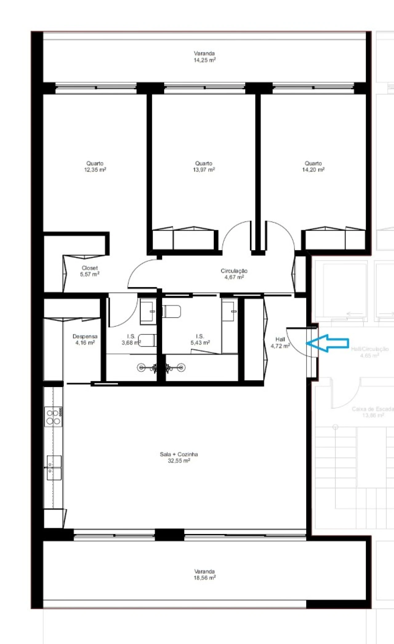 Novo apartamento T3 constituído por hall de entrada, sala com cozinha equipada, despensa, hall de quartos, 3 quartos com roupeiros (um deles suíte com closet), e casa de banho social. Quer o hall dos quartos, quer o hall de entrada possuem roupeiros. A sala e a cozinha possuem uma varanda superior a 18m2, e nos quartos a varanda é superior a 14m2. Cada apartamento possui uma garagem box fechada para 2 viaturas com áreas de 37 a 70m2.