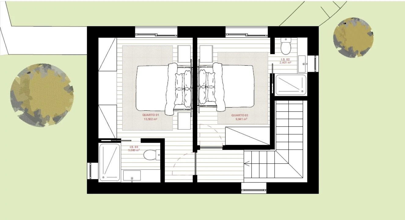 A casa desenvolvese em dois pisos. No piso superior encontramse duas suítes amplas e luminosas, pensadas para garantir privacidade e conforto. No piso inferior, a cozinha e a sala unemse num acolhedor open space que privilegia a convivência e a fluidez dos espaços, complementado por uma prática casa de banho de serviço.