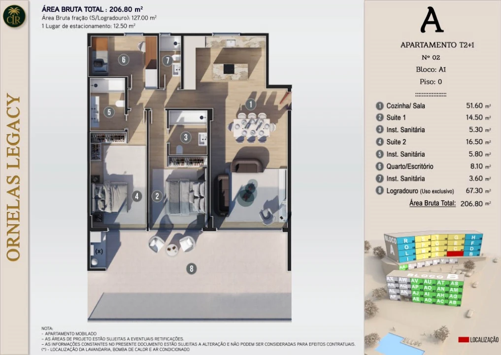 Condomínio fechado composto por 50 apartamentos (T0, T1, T2, T2+1 e T3), com arquitetura contemporânea, excelentes acabamentos, ótima exposição solar e áreas bem distribuídas.