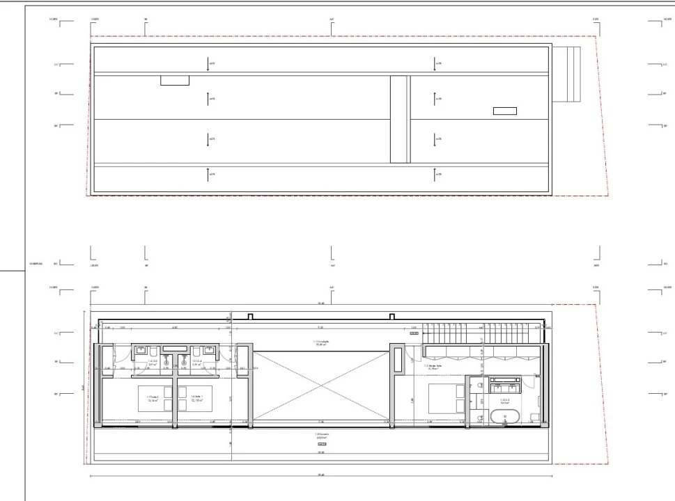 A zona privativa, no primeiro andar, conta com 3 suites com áreas entre os 15 m2 e 31 m2, todas com acesso a uma varanda de 45 m2 com vistas abertas .