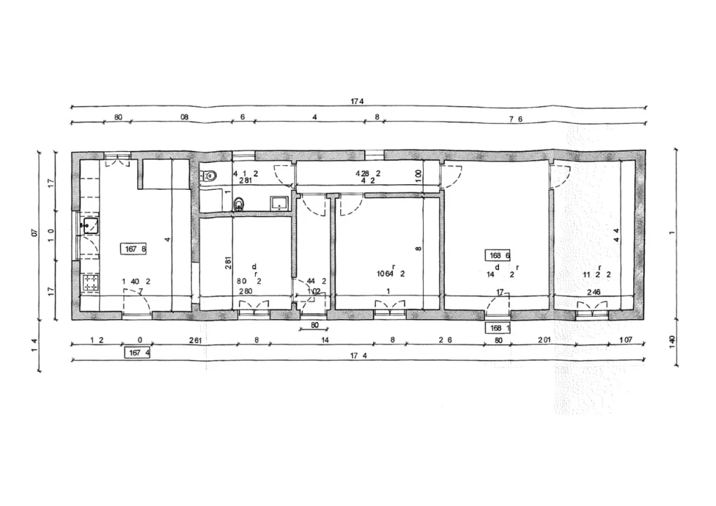 Composta por Sala 14,65 m2, 2 quartos 11,48 m2, 8,34 m2 e 11,08 m2 respectivamente, uma casa de banho 4,40 m2, zona de circulação 7,88 m2 e uma cozinha com sala de refeiçoes 21,26 m2.