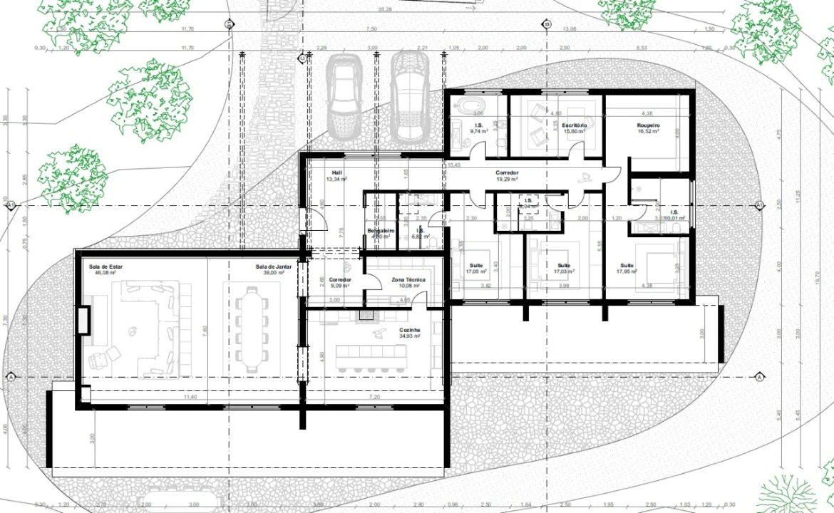 Esta moradia projetada é térrea, é composta por 2 Salas (jantar e de estar, com cerca de 85m2), 3 Suítes (todas áreas de 17m2, com WC privativa e a Master Suíte com Closet), Escritório, Cozinha com Corredor e Zona Técnica, WC social e Hall com Bengaleiro.