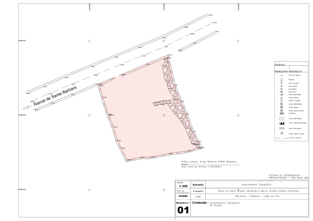 Com 756 m² de área total, este terreno destaca-se pela sua localização e características ímpares: vista mar desafogada e panorâmica, orientado a sul com exposição solar todo o dia, e terreno praticamente plano, ideal para construção sem custos adicionais de movimentação de terras. O perímetro é delimitado por muros típicos em pedra seca, preservando a identidade arquitetónica da ilha.