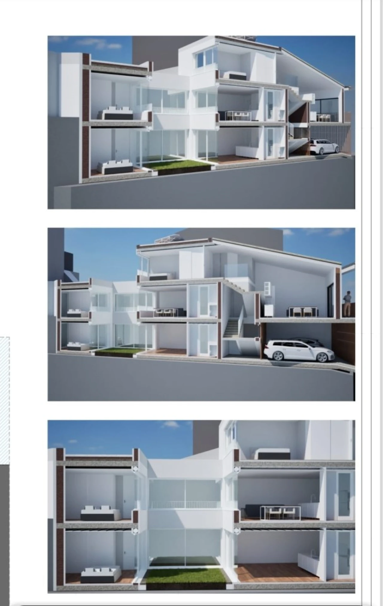 O projeto contempla a construção de dois apartamentos T1, cada um com 85 m², e um apartamento T2 com 95 m², oferecendo áreas amplas e muito atrativas para o mercado atual. Está ainda prevista uma garagem para dois carros, localizada à entrada do edifício ao nível do rés do chão, garantindo funcionalidade e comodidade no acesso.