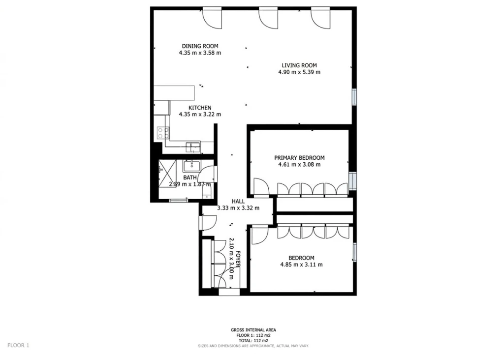 O imóvel dispõe de uma ampla sala em open space com kitchenette totalmente integrada, equipada com uma elegante ilha, ideal para momentos de convívio e refeições práticas. Os dois quartos contam com roupeiros embutidos, oferecendo excelente capacidade de arrumação, sendo complementados por um hall de entrada também com roupeiro e têm ainda um WC completo com base de duche.