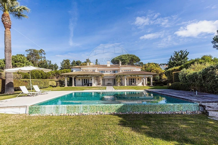 O exterior da propriedade é igualmente impressionante, com um grande jardim bem cuidado e uma piscina privada, criando o ambiente ideal para desfrutar do clima ameno da região.