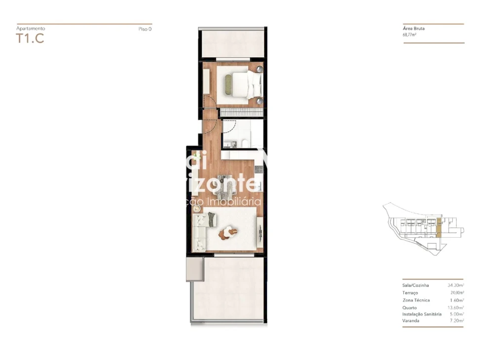 T1 com terraço área de 24 m2