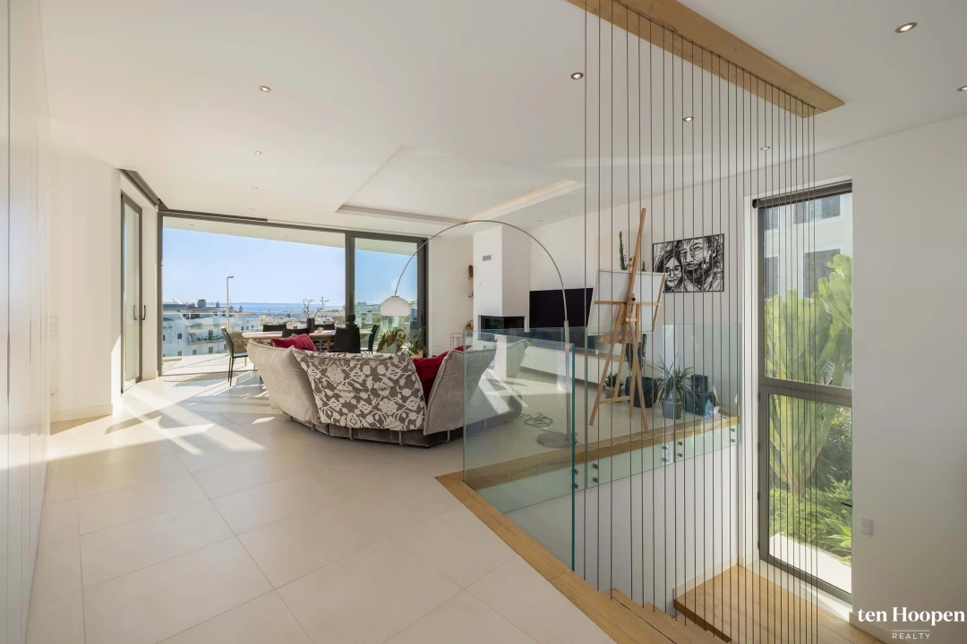 A propriedade foi cuidadosamente projetada para seguir um conceito de vida invertida, aproveitando ao máximo seu cenário em encostas. Ao entrar na casa, você chega diretamente ao andar principal da sala, onde uma planta aberta luminosa e espaçosa conecta a cozinha, o jantar e as áreas de lounge. Grandes portas deslizantes do chão ao teto se abrem para um amplo terraço, criando um fluxo contínuo entre dentro e fora de casa. A piscina é integrada de forma única neste nível, formando um elemento central de design ao redor do qual o espaço de convivência se enrola. Uma lareira na área de estar adiciona calor e atmosfera, complementando a arquitetura limpa e contemporânea.