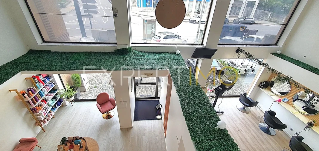 Área Comercial com 115m² distribuída por R/c com 2 Casas de Banho e Mezzanine com 2 Casas de Banho. Cave com 115m² com Elevador interior ligação ao R/c. A Loja usufrui de muita Luz Natural através da Frente Loja com Montras de Dimensão muito Generosa e Traseira com Janelas. Destinada a Comércio, atualmente um Studio Cabeleireiro é Polivalente na Área Comercial.