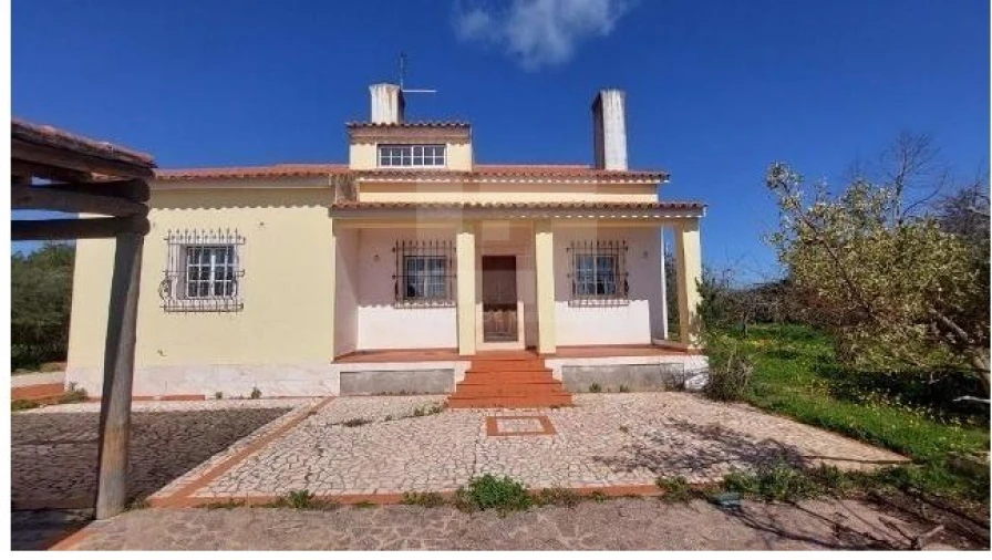 A moradia dispõe ainda de alpendre e está implantada num terreno com área total de 7.500 m², que inclui também um armazém e duas parcelas rústicas.