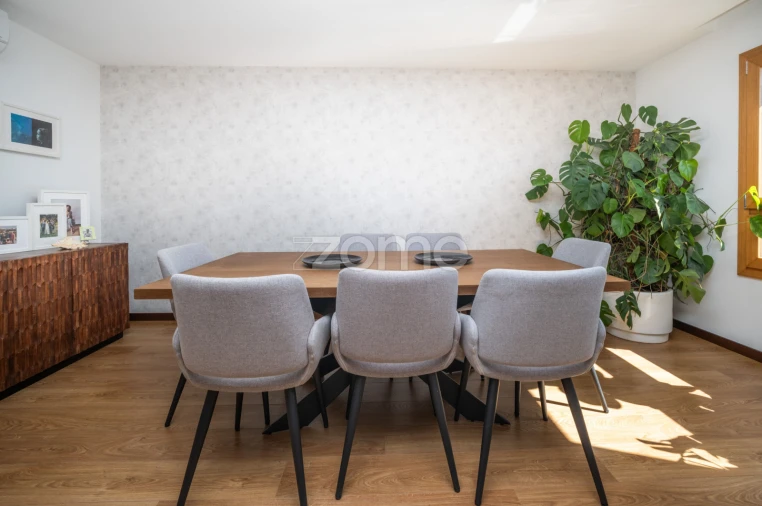 A sala assume um papel central: ampla (38 m²) e luminosa, permite criar de forma natural zonas de estar e jantar, mantendo uma circulação fluida. Um espaço versátil, preparado tanto para o quotidiano como para receber.