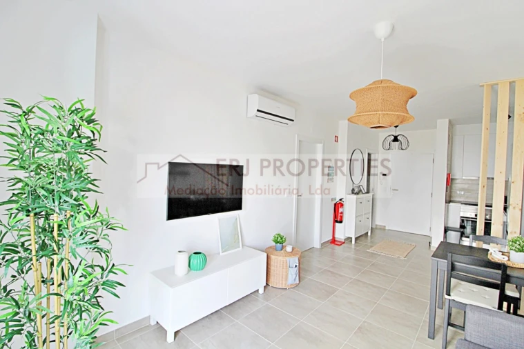 Este elegante apartamento T1, totalmente novo, combina linhas modernas com o conforto ideal para umas férias relaxantes no Algarve.
