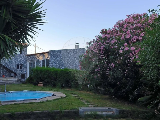 No exterior, encontra-se uma piscina com capacidade de 17m³ de água, jardim com diversas árvores de fruto, palmeiras e espaço amplo para cultivo de legumes — ideal para quem procura maior independência alimentar. A propriedade inclui também um poço com água natural potável e colmeias de abelhas.