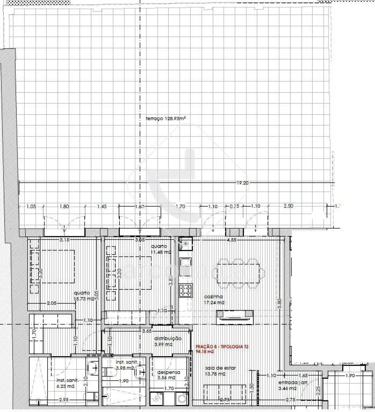 Com uma área bruta de 198,11 m², o imóvel apresenta uma organização harmoniosa dos espaços, onde a zona social em open space integra sala e cozinha de forma funcional e luminosa. A área privada é composta por um quarto com roupeiro embutido, uma casa de banho completa e uma suite com closet e instalação sanitária privativa. Todas as divisões beneficiam de acesso direto a um extraordinário terraço com 103 m², criando uma extensão natural da casa e proporcionando um ambiente ideal para momentos de lazer ao ar livre.