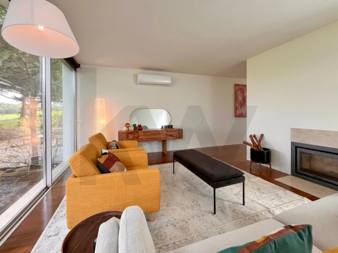 Sala espaçosa e luminosa, com amplas janelas que proporcionam vistas diretas para o campo de golfe. Conta ainda com lareira e ligação direta ao jardim e terraço privativo, onde se encontra uma área de churrasqueira perfeita para momentos de lazer.