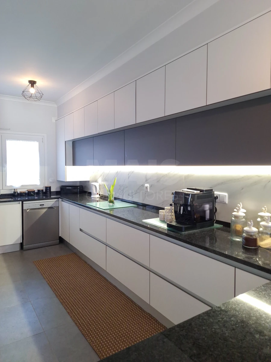 No rés-do-chão, destaca-se uma ampla sala e cozinha em open space, com ar condicionado, proporcionando um ambiente moderno e funcional. A cozinha encontra-se equipada com placa elétrica, forno, exaustor e micro-ondas. Neste piso dispõe ainda de uma casa de banho, despensa e garagem com acesso direto ao interior da habitação, garantindo maior comodidade e segurança. Conta também com um agradável jardim de inverno e um logradouro com churrasqueira, perfeito para momentos de lazer em família ou com amigos.
