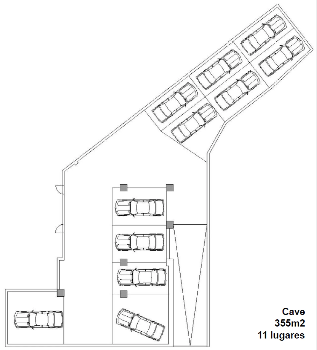 A cave, com generosos 355m², oferece espaço para 11 lugares de garagem e arrumos, ideal para otimizar a organização e armazenamento de arquivos.