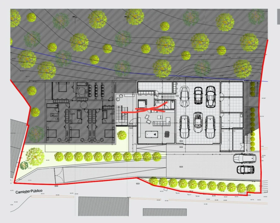 O projeto de arquitetura considera 1.114 m2 de área de construção em 3 pisos, tendo sido aprovado para 6 quartos-suite (moradia V6).
