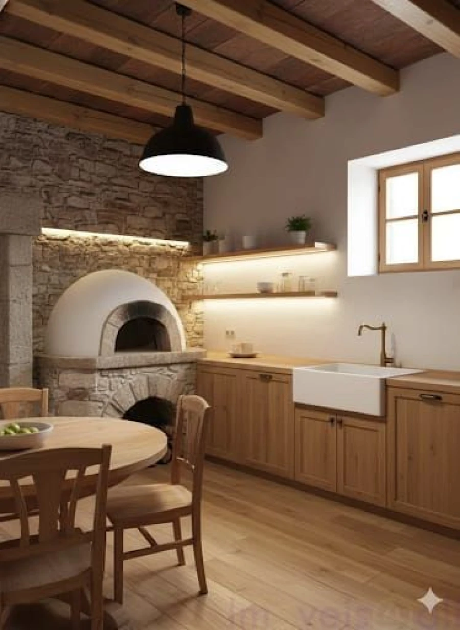 Esta moradia conta com uma cave, onde pode ter a lavandaria uma casa de banho de serviço uma área de arrumos ou para lazer como um salão de jogos ,no rés do chão você pode ter uma cozinha ampla com iluminação por painéis solares e pode conservar o forno de cimento e a lareira tendo acesso ao primeiro andar com uma escadaria o que torna pratico .