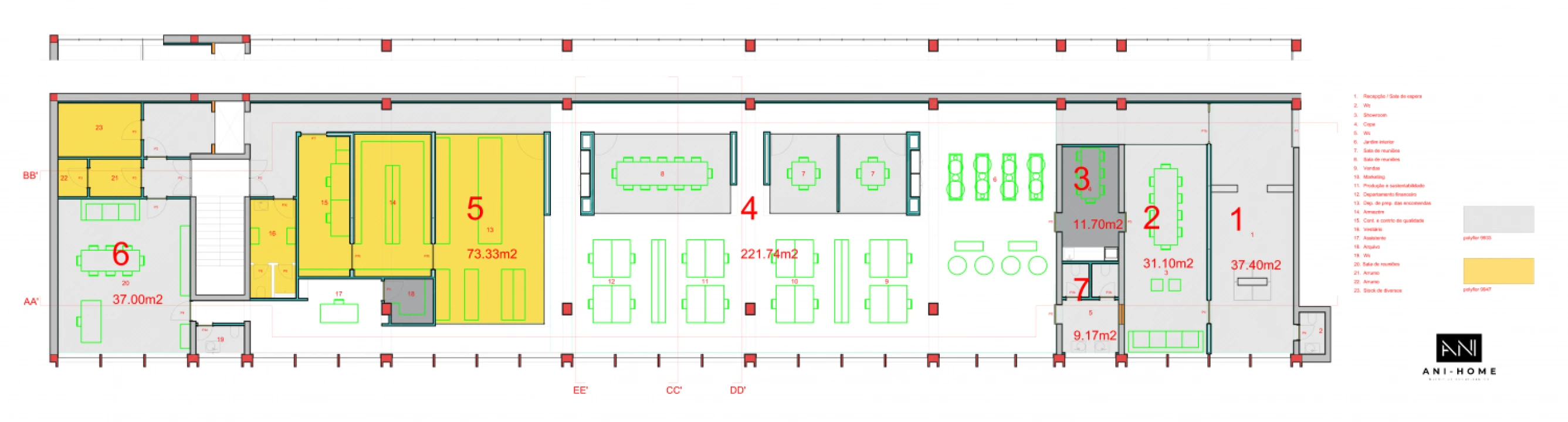Com cinco casas de banho, o escritório adapta-se perfeitamente a equipas numerosas ou a uma divisão por departamentos. A disposição do espaço é ampla e versátil, com boa entrada de luz natural e excelente exposição solar, ideal para diferentes configurações de trabalho.