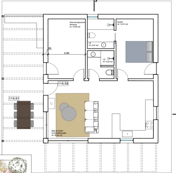 A moradia conta com uma suíte, zona de refeições, casa de banho social e uma ampla sala em open space integrada com a cozinha – perfeita para convívios descontraídos e dias de puro lazer. A mezzanine acrescenta um toque contemporâneo e versátil, ideal como escritório, sala de leitura ou quarto extra.