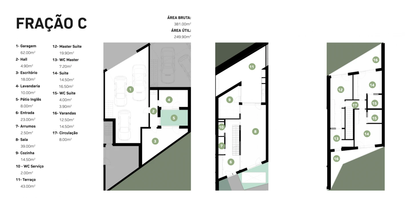 Cada moradia, além de contar com áreas habitacionais privadas generosas, amplos terraços, pátios e varandas, conta ainda com uma garagem individual, com acesso direto à habitação.