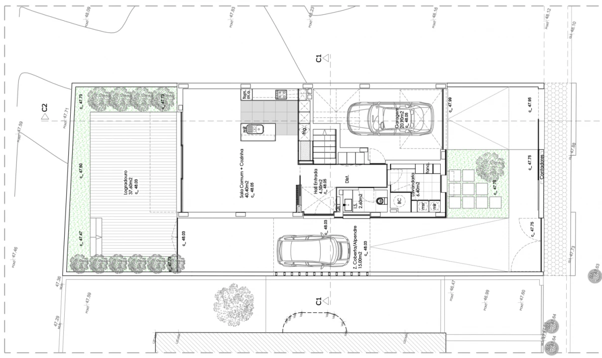 No piso térreo, encontramos um hall de entrada, uma ampla sala comum com ligação direta ao logradouro posterior, ideal para momentos de lazer e convívio ao ar livre, cozinha totalmente equipada, WC de serviço, lavandaria e ainda uma divisão versátil que poderá funcionar como escritório ou garagem. O espaço exterior contempla logradouro frontal, lateral e posterior, proporcionando privacidade e excelente aproveitamento solar.