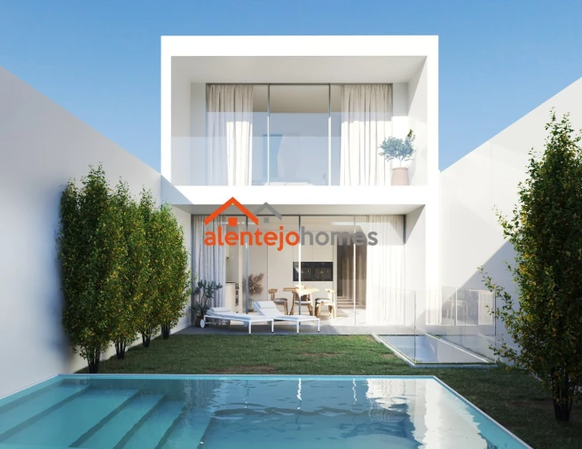 A moradia distribui-se por dois pisos e conta com : cozinha e sala em open space,, uma suíte , dois quartos ( com opção de mais um) , duas WC de serviço( uma em cada piso) , jardim e piscina.