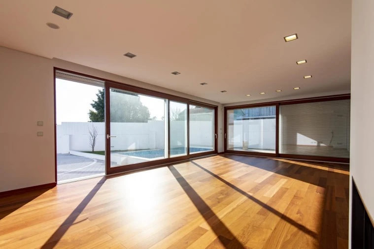 A zona social é composta por uma sala ampla e luminosa, com vista para a piscina e acesso direto ao exterior, criando uma perfeita ligação entre os espaços interiores e exteriores, ideal para momentos de lazer e convívio.