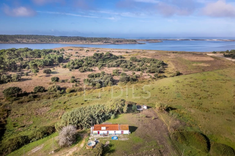 Quinta T2+1 com 11 hectares, localizada junto à Lagoa de Santo André, composta por uma habitação térrea com 120 m² e um armazém agrícola. O terreno apresenta topografia suave com faixas de vegetação autóctone que preservam a continuidade paisagística até à linha da lagoa.