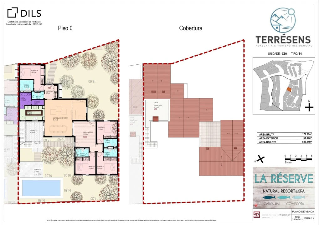 Moradia T4, com 179,88 m2 de área bruta e implantada num lote com 545,24 m2 no centro do Carvalhal, no La Réserve, a poucos minutos da Praia.
