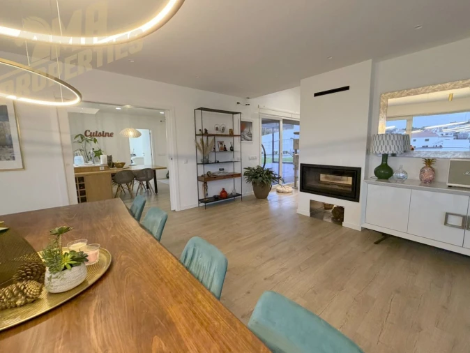 • Área Social: Sala de estar ampla com lareira e ligação fluida ao exterior. A sala de jantar comunica com o terraço através de vãos envidraçados, prolongando o espaço de convívio.