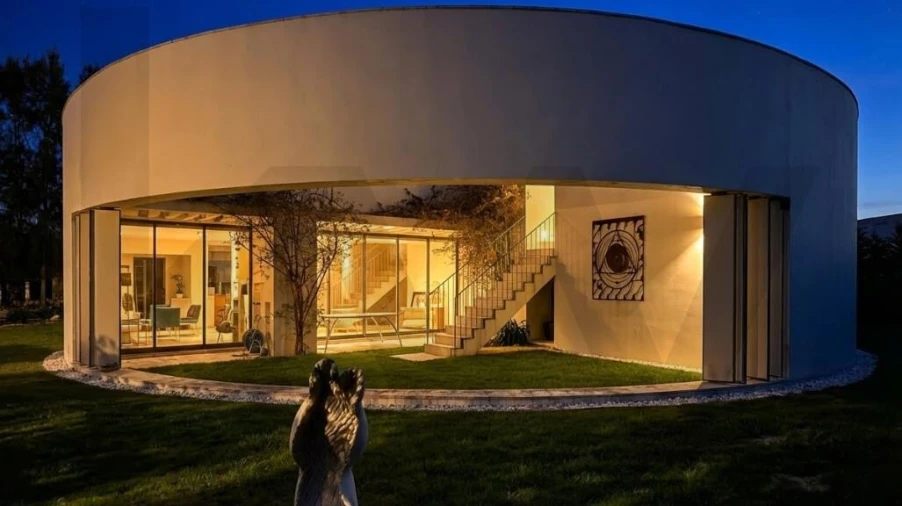 Concebida pelos reconhecidos arquitetos Graça Dias e Egas Vieira, esta distinta moradia de planta circular e térrea destaca-se pelo seu design singular e funcionalidade. O interior apresenta uma ampla sala de estar com excelente luminosidade natural e lareira de dupla face, criando um ambiente acolhedor e elegante. A cozinha, totalmente equipada, integra um agradável pátio interior que reforça a entrada de luz natural.