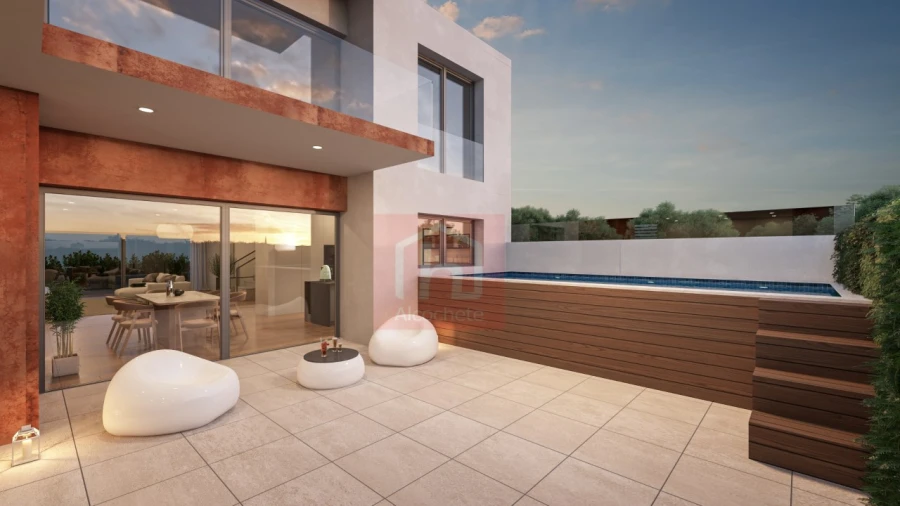 Piso 0 Área social da moradia, com uma sala ampla e cozinha em open space, criando um ambiente moderno, elegante e com muita luz natural, Wc, cozinha totalmente equipada com eletrodomésticos Siemens, acesso direto ao exterior onde encontramos um espaço pensado para o lazer e convívio, piscina privada com 16 m2, terraço espaçoso com churrasqueira e zona de refeições.