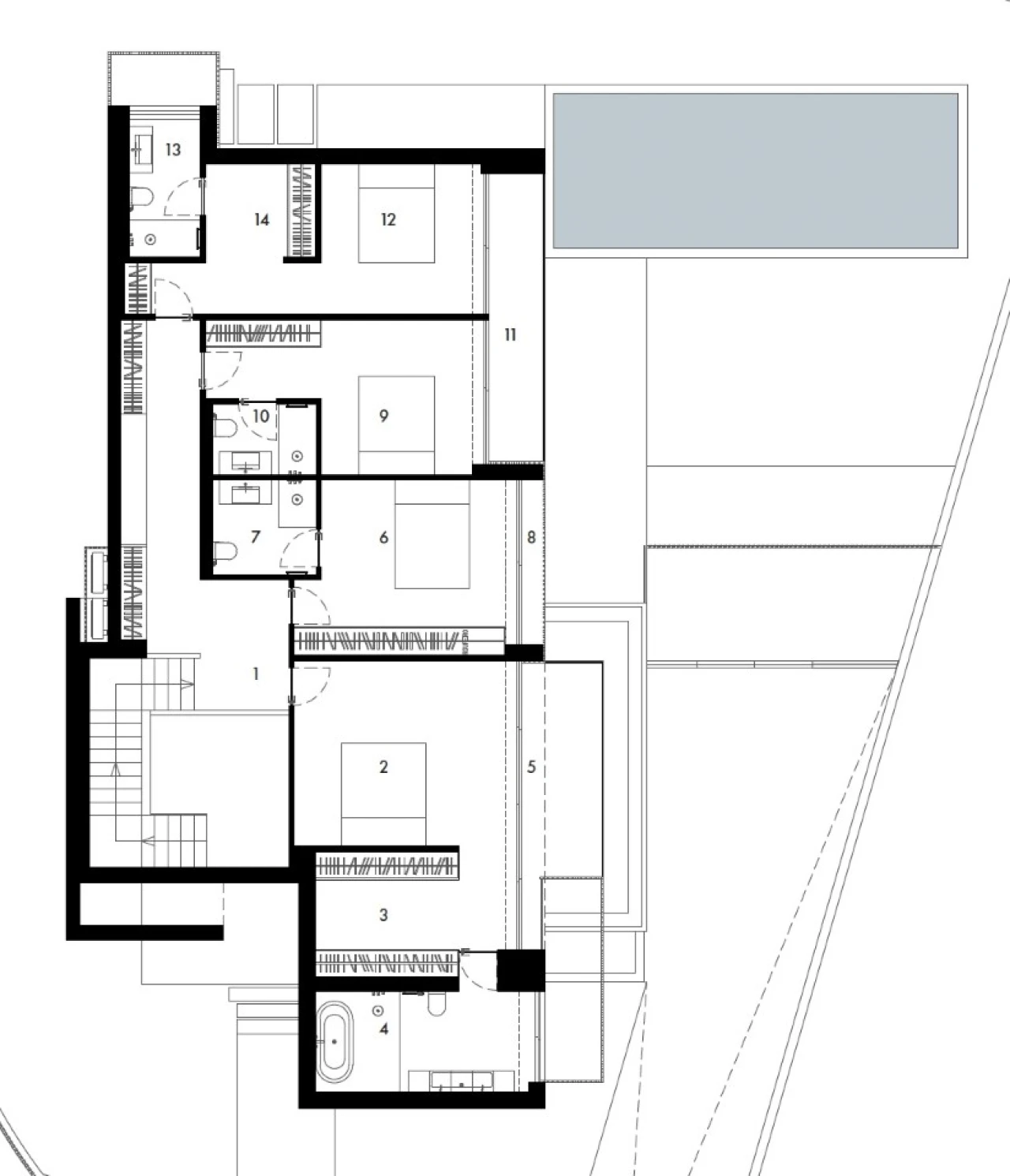 Ao subir ao primeiro andar a zona privada oferece um refúgio de tranquilidade absoluta, com 4 suítes espaçosas, varandas panorâmicas e vistas deslumbrantes que elevam o bem-estar a outro nível.