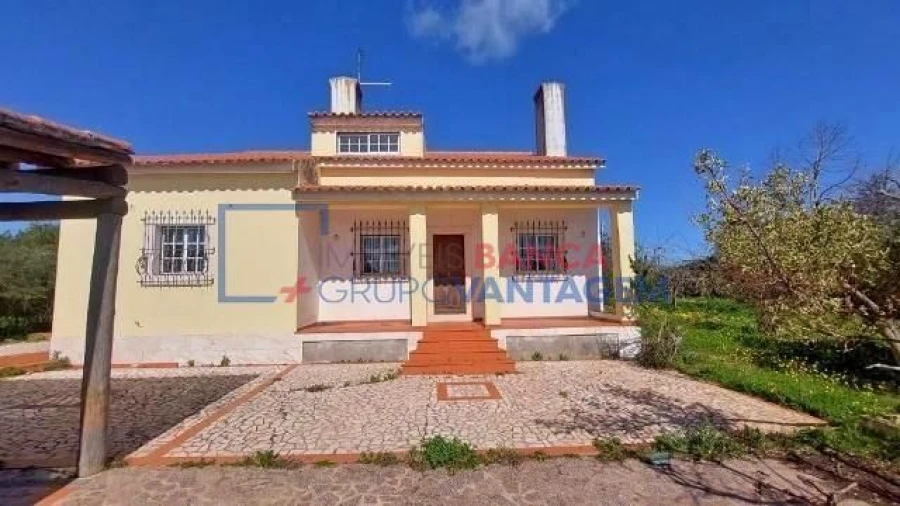A moradia dispõe ainda de alpendre e está implantada num terreno com área total de 7.500 m², que inclui também um armazém e duas parcelas rústicas.
