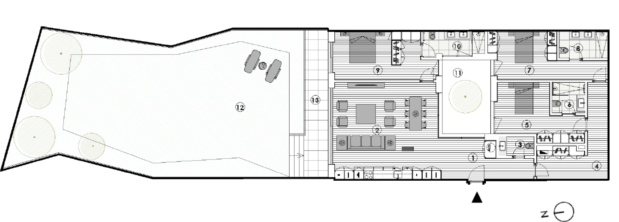Na zona privada, o imóvel destaca-se pelo seu conceito exclusivo de três suítes, todas com casa de banho privativa, garantindo máximo conforto e independência para toda a família ou convidados. Dispõe ainda de uma casa de banho de serviço de apoio à zona social.